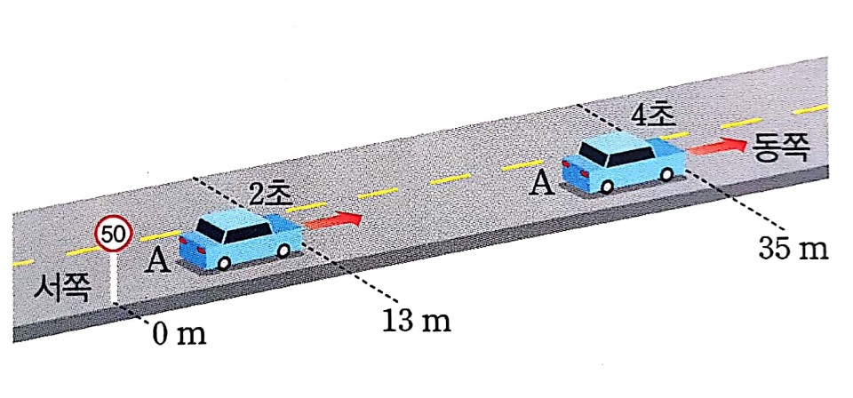 자동차의 변위가 몇 m니? 그렇지. 동쪽으로 22m, +22m 지? 2초 동안 변위가 +22m니까 자동차의 속도는 11m/s야. 속도는 변위를 시간으로 나눴으니 속도의 방향과 변위의 방향이 같겠지?