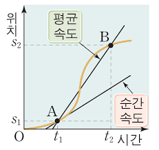 위의 그래프에서 물체의 평균 속도를 구하기 위해서는 전체 변위 S2-S1를 걸린 시간 t2-t1으로 나눠주면 되지.
