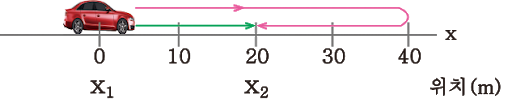 자동차의 변위는 '+20m'야. 숫자만 덩그러니 보여주는 '이동거리'와는 달리 '변위'에는 +,-와 같은 방향이 표시되어 있어. 즉 변위를 보면 물체가 어떤 방향으로 얼마큼의 크기로 이동했는지 알 수 있지.