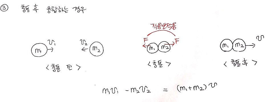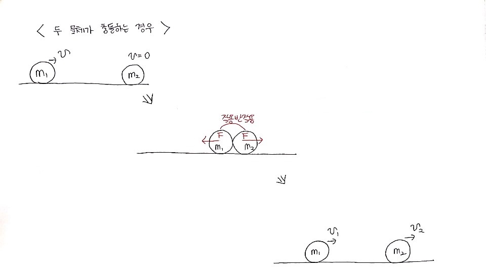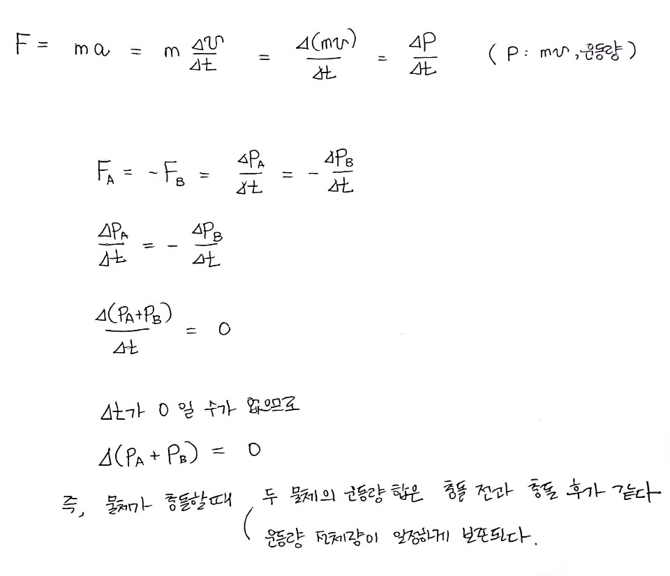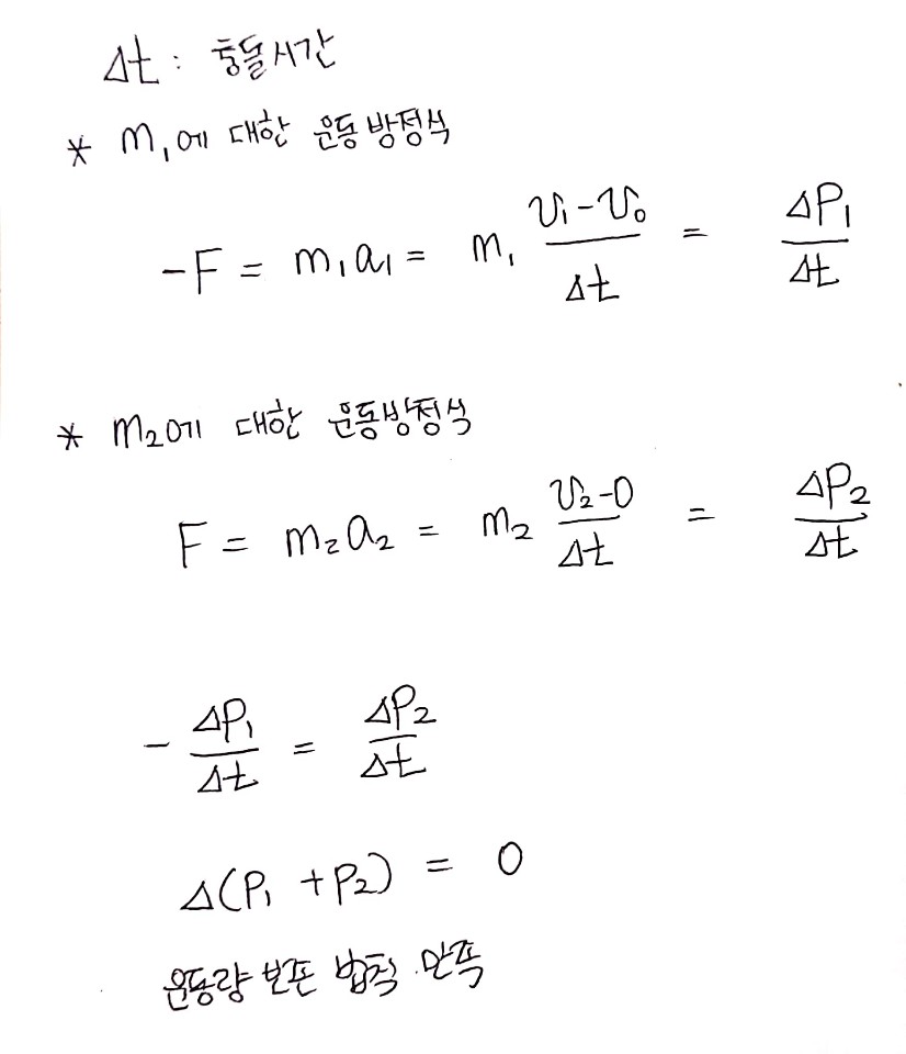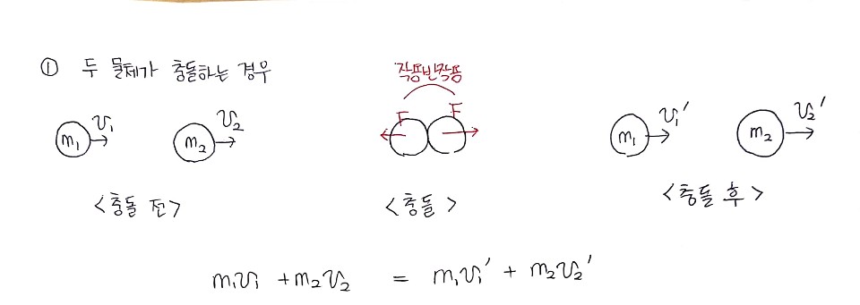 힘 F의 크기와는 상관없이 충돌할 때 두 물체가 작용 반작용 법칙을 만족하기 때문에 충돌 전 물체의 운동량 합과 충돌 후 물체의 운동량 합은 보존됨을 잊지 마!!