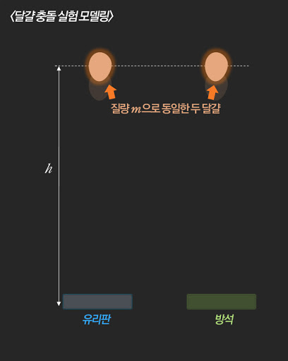 질량이 같은 두 달걀에게 동일한 중력이 작용하기 때문에 두 달걀의 가속도는 같아. 그리고 같은 거리를 이동하기 때문에 유리판과 방석에 같은 속력으로 동시에 도달하게 돼.