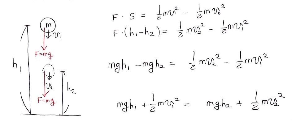 물체가 h1에 있을 때 갖는 에너지의 합과 h2에 있을 때 갖는 에너지의 합이 같다는 게 '일-에너지 관계'로 확인됐지? 중력이 작용하는 공간에서 보존되는 에너지의 합이 의미가 있다고 생각해서 '퍼텐셜 에너지와 운동 에너지의 합'을 '역학적 에너지'라고 부르는 거야.