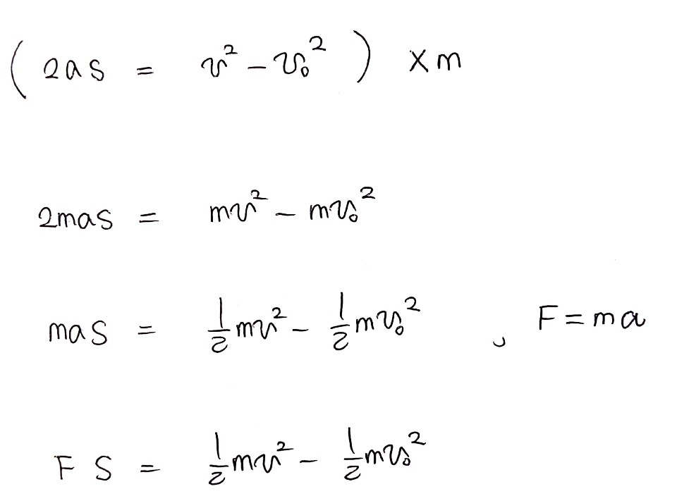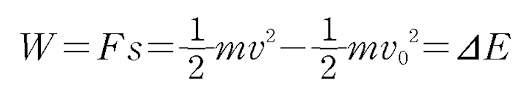 뭔가 물체를 작용한 힘 F의 방향으로 s만큼 이동시켜보니 속도가 변한다는 걸 산술적으로 나타낸 느낌이 들지? 결국 시간 대신에 이동 거리를 이용해서 물체의 속도 정보를 파악한 거야. 이제 식의 항목들에 이름을 붙여보자. 사실 중학교 과학 시간에 봐왔던 낯익은 것들이잖아?