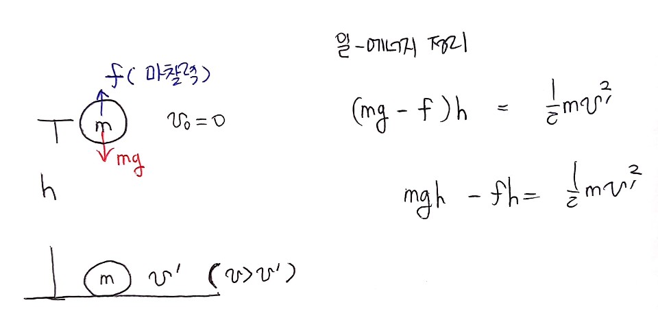 낙하 방향의 반대 방향으로 마찰력이 작용하기 때문에 마찰이 없는 상황일 때보다 물체의 가속도는 줄어들게 되고, 당연히 지면에 도달하는 속력 v'는 v보다 작을 거야.