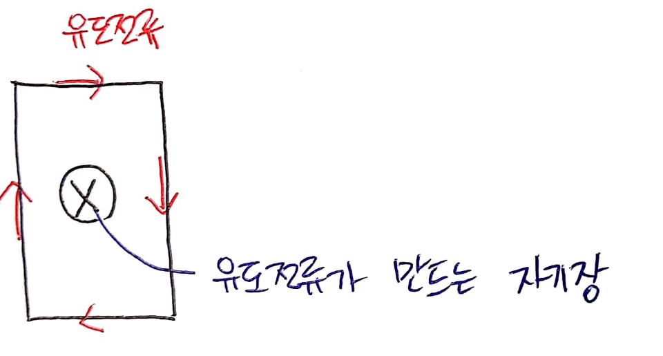 유도 기전력에 의해서 전류는 반시계 방향으로 흐르게 되고, 이 유도 전류에 의해서 지면에서 나오는 방향의 자기장이 만들어지는 거야. 렌츠 법칙은 이 중간 과정을 생략하고 유도 전류가 만드는 자기장 방향을 다이렉트로 알 수 있게 해주는 셈이지.