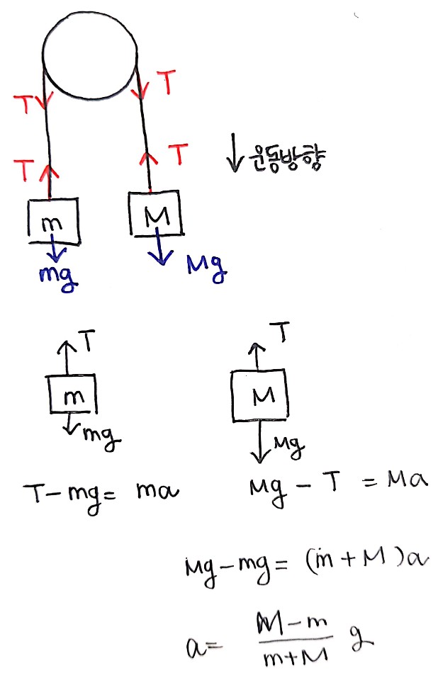 물체가 줄로 연결된 채 같이 움직이므로 두 물체의 가속도는 a로 같다.