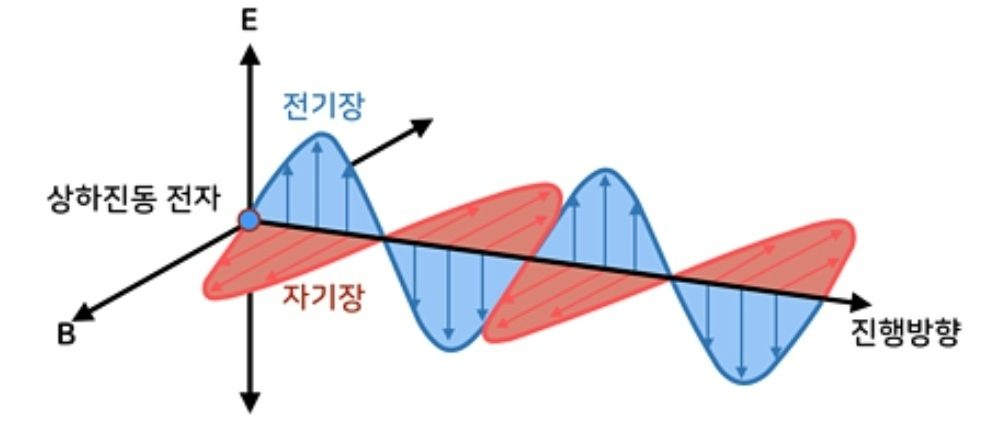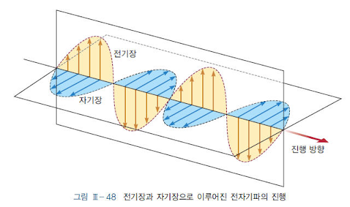 전기장과 자기장이 서로를 유도하며 진행하는 파동을 '전자기파'라 합니다. 이때 전기장과 자기장의 진동 방향은 서로 수직이고, 전자기파는 전기장과 자기장의 진동 방향에 수직인 방향으로 진행하는 파동이므로 횡파입니다. 전자기파는 매질이 없어도(=진공에서도) 진행 가능한 파동입니다. 빛의 속력 c는 진공 속의 전기장 E와 자기장 B의 사이에 c=E/B의 관계를 만족합니다.
