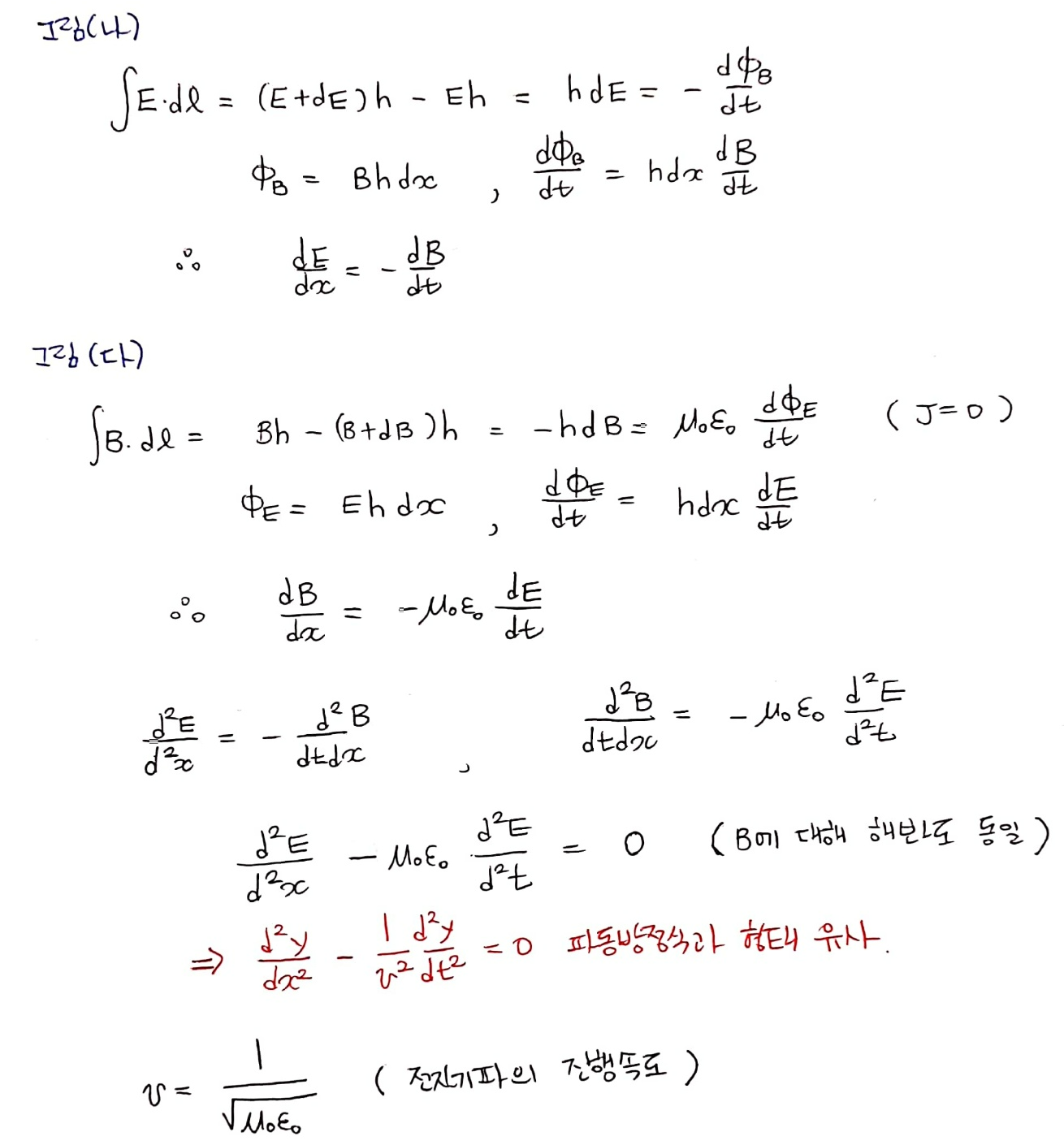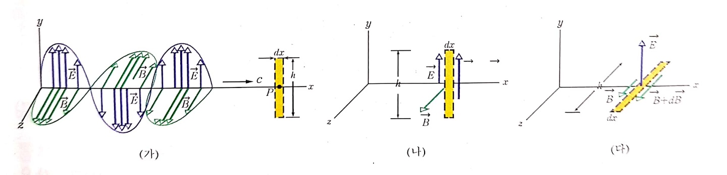(가)는 위상이 같고 각각의 진동 방향이 전자기파 진행 방향에 수직인 전기장과 자기장 벡터 E, B의 위치에 따른 진폭 그래프입니다. (나)의 점선 직사각형 고리(=반시계 방향)에 대한 패러데이 법칙과 그림 (다)의 점선 직사각형 고리(=반시계 방향)에 대한 암페어 법칙을 적용하겠습니다.