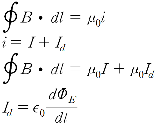 맥스웰은 암페어 법칙에 변위 전류 항을 포함하여 식을 수정합니다.