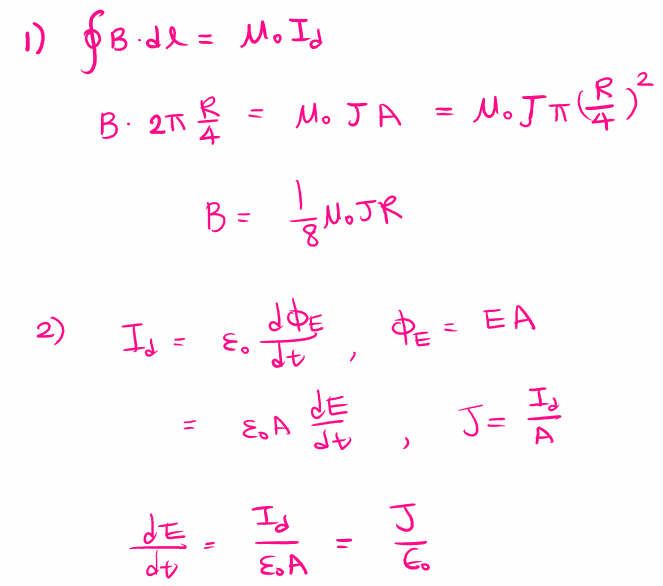 원형 극판의 지름이 R인 평행판 축전기가 대전되면 극판 사이에서 변위 전류의 전류 밀도 크기는 J로 균일하다. (극판 면적 A일 때, 전류밀도 J=I/A )