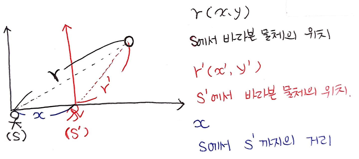 물체가 있다. 정지한 관찰자(S)와 운동하는 관찰자(S')가 물체를 바라보는 위치 좌표는 다르게 정의될 것이다. 이때 위치 변수의 관계와 그에 따른 속도와 가속도 관계가 다음과 같이 정의된다.
