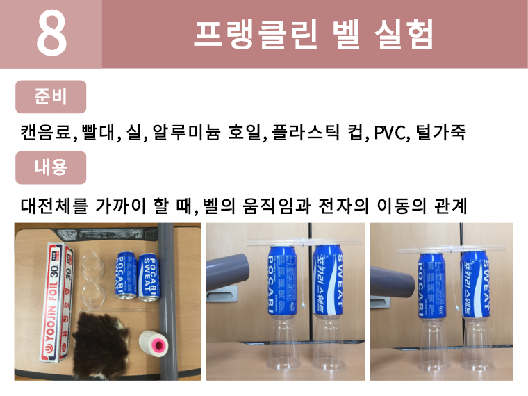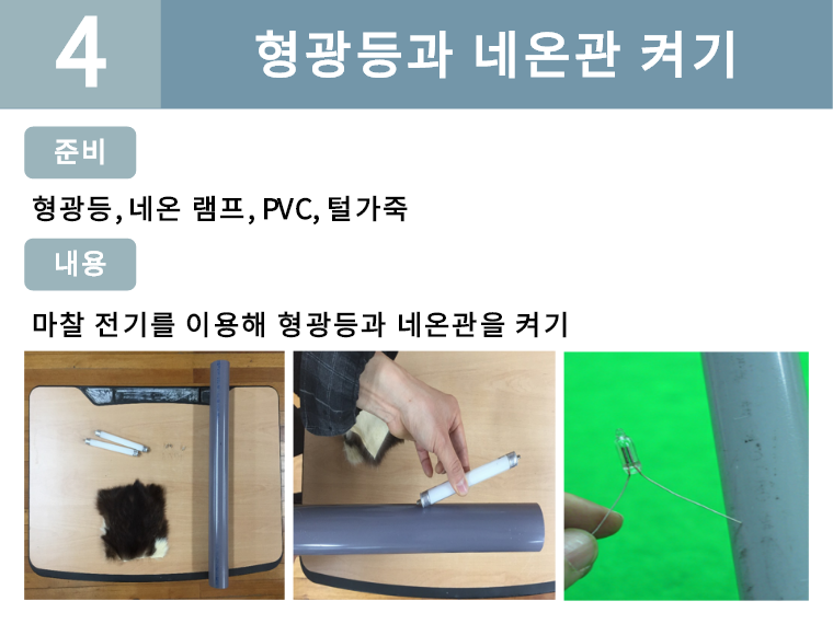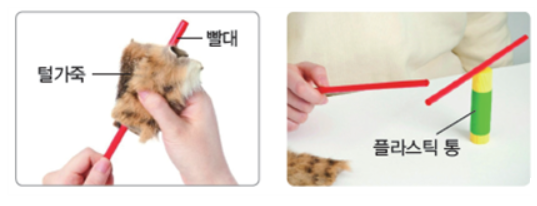 그림과 같이 빨대 2 개를 털가죽에 마찰한 다음, 한 빨대를 플라스틱 통 위에 올려놓고 다른 빨대를 가까이 하였다.