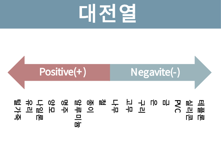 이처럼 똑같은 물체지만 어떤 걸로 마찰시켰는지에 따라 물체의 대전된 전기의 종류에 차이가 있다. 이는 '전자를 잃는 정도'란 기준에 따라 물체에 일련의 순서가 있음을 의미하고, 이 순서를 '대전열'이라 한다.