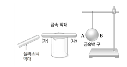 그림과 같이 장치하고 털가죽으로 마찰한 플라스틱 막대를 비커 위의 금속 막대의 한쪽에 가까이 하였다. 이때 금속박 구가 움직이는 방향에 대해 설명하시오.