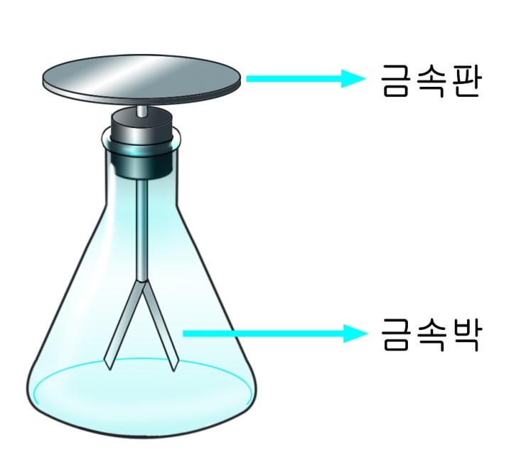 (1) 그림과 같이 전체가 (-)전기로 대전된 검전기를 만드는 방법을 서술하시오.