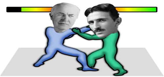 그러나 테슬라는 교류 전기의 특성을 활용한다면 전압의 크기를 자유자재로 변화시킬 수 있다; 즉 변압이 가능하기 때문에 보다 먼 거리에 있는 수요자들 입장에서 전기에너지 공급이 쉬워지고, 그에 따라 전기 생산 단가를 낮게 하여 전기 에너지를 값싸게 이용할 수 있다고 주장합니다.