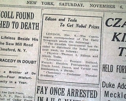 1915년 11월 6일자 뉴욕타임스는 에디슨과 니콜라이 테슬라가 노벨물리학상의 공동 수상자로 결정되었다는 기사를 내보냈지만 정작 수상의 영예는 다른 사람에게 돌아갔습니다. 막판에 수상자를 바꾼 이유는 아직도 분명하게 밝혀지지 않고 있지만 정부가 그들의 연구 성과가 알려지는게 두려워서 압력을 넣었다는 썰이 지배적입니다.