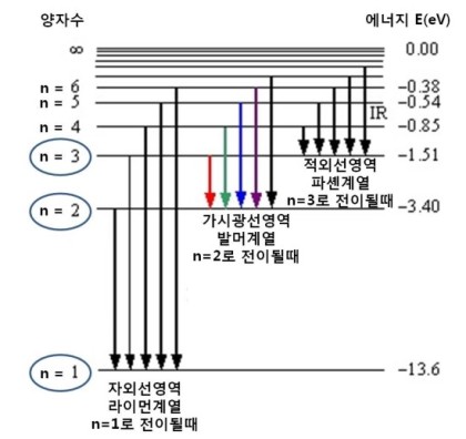 발머, 라이먼, 파셴 계열은 전이 궤도에 따라 방출되거나 흡수되는 빛의 종류를 묶어놓은 덩어리들이다. 그림을 통해 궤도 상태(n)에 따른 에너지값을 확인하고, 전자가 각각의 궤도를 이동할 때 그 차이만큼의 에너지를 빛이 방출하거나 흡수함을 확인하라.