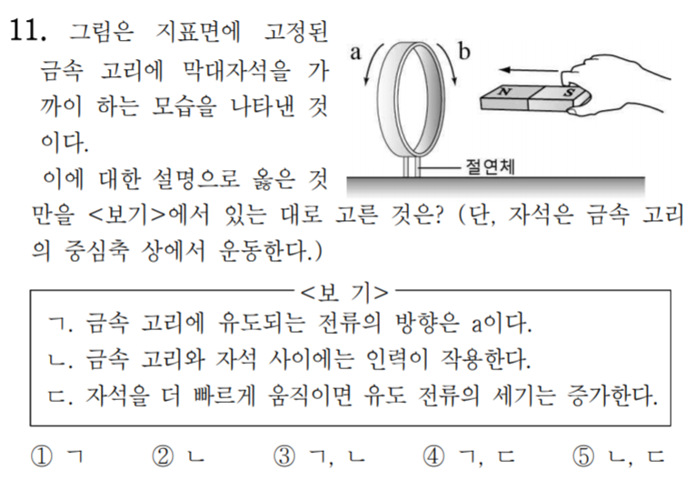1. N극이 가까이 접근 → 이를 거부(척력 필요) → 유도 전류가 코일 윗방향으로 나가는 자기장(N극) 유도