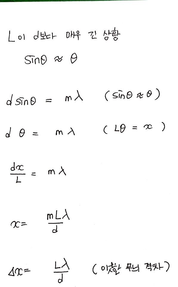 식에 따르면 이웃한 무늬 간격은 이중 슬릿의 간격(d)과 스크린까지의 거리(L) 그리고 빛의 파장(λ)에만 영향을 받는다.