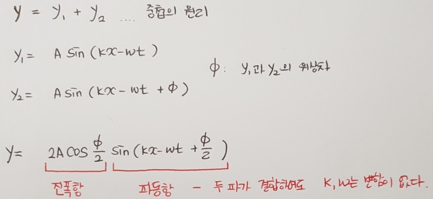 두 파동이 겹칠 때 매질의 변위(y)는 그 점을 지나는 각각의 파동의 변위(y1, y2)의 합과 같다. 파동이 중첩되어도 원래 파동이 갖던 각각의 파장과 주기는 변하지 않는다. 그 이유는 파동은 철저히 독립적이기 때문이다. 따라서 각 파동은 자신의 속력을 유지한 채 다시 원래의 파형으로 돌아와서 각자 가던 길을 간다.