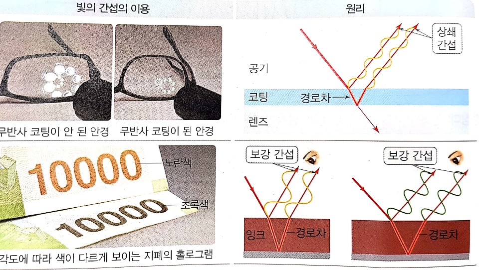 ①무반사 코팅 렌즈와 각도에 따라 색이 다르게 보이는 지폐의 홀로그램