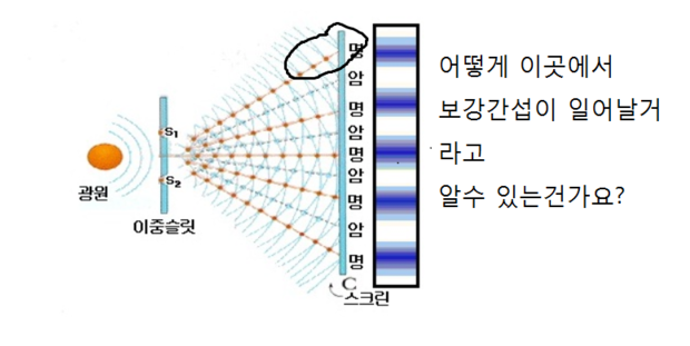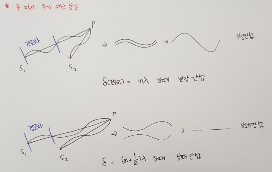 S1과 S2에서 나온 두 빛이 스크린 상의 임의의 무늬까지 가는 데 이동한 경로의 차는 굉장히 다양할 텐데, 전에 공부했었듯이 같은 위상으로 진행하는 두 파동의 경로차가 반파장의 짝수 배일 때는 보강 간섭이 일어나고, 반파장의 홀수 배일 때는 상쇄 간섭이 일어난다.