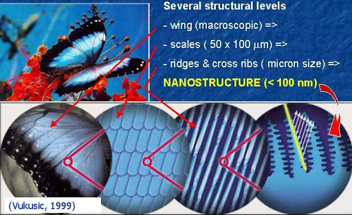 모르포 나비의 황홀한 푸른색은 어느 염료로도 구현할 수 없다. 이 유니크한 푸른빛의 비밀은 빛의 간섭에 있기 때문이다. 모르포 나비의 날개는 얇은 막들이 여러 겹으로 쌓여 있는 구조로 되어 있다. 이 격자 구조에서 빛들이 보강 간섭한 결과, 나비 날개를 보는 각도에 따라 푸른 빛의 명도와 채도가 바뀐다.