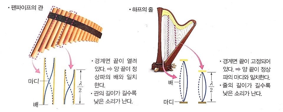 팬파이프의 관이나 하프의 줄에서는 경계면에서 파동이 반사하여 관 내부나 줄에 정상파가 만들어진다. 이때 아래와 같은 경계면의 조건을 만족하는 파동만이 정상파를 이루므로, 정상파의 파장은 관이나 줄의 길이에 의해 결정된다.