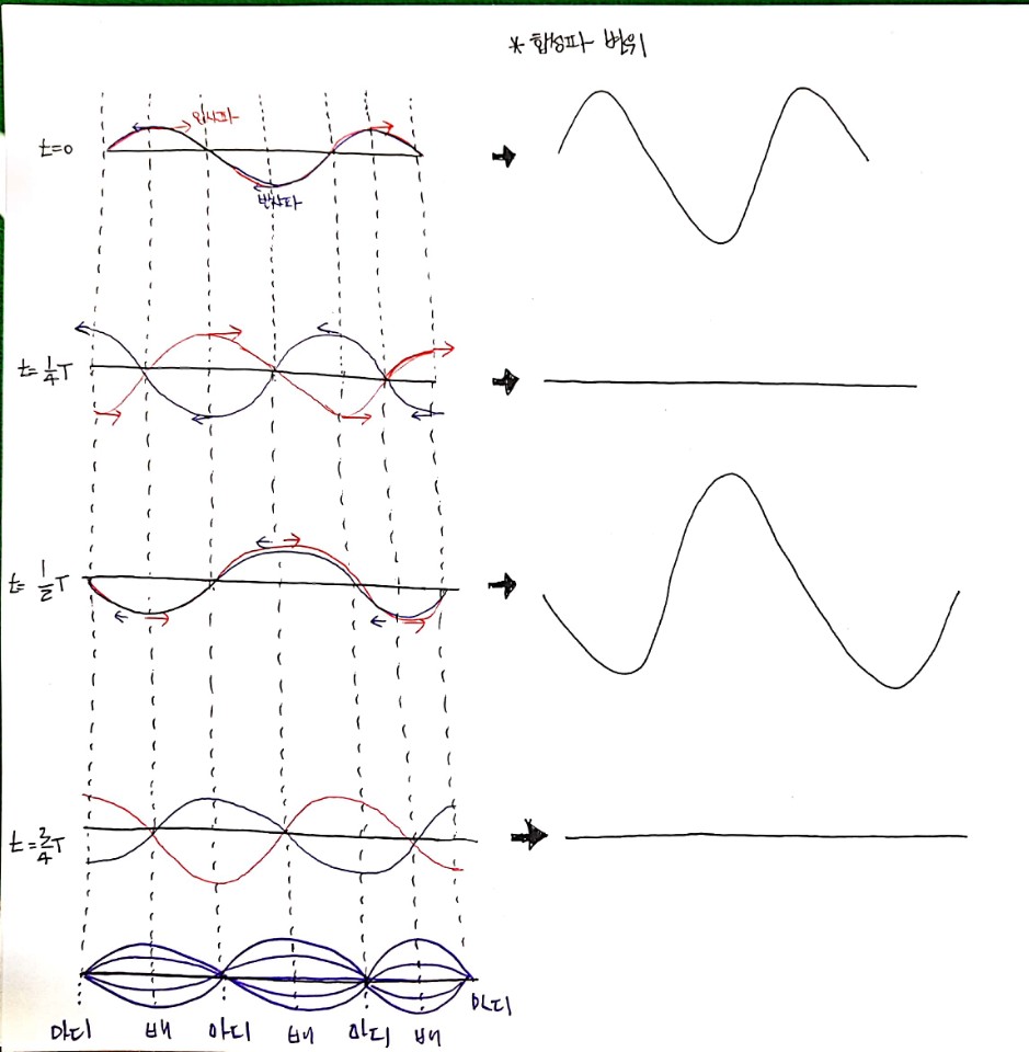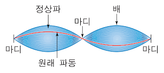 동일한 매질에서 진폭과 파장이 동일한 두 파동이 서로 반대 방향으로 진행하여 중첩된 결과, 어느 방향으로도 진행하지 않아 제자리에서 진동하는 것처럼 보이는 파동을 '정상파'라 한다.
