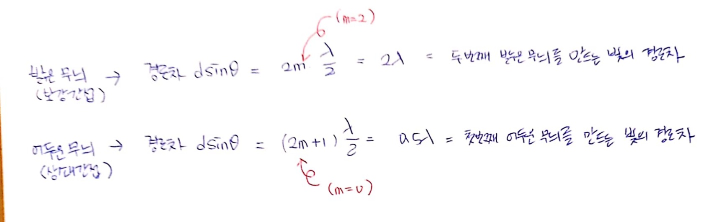 중앙 밝은 무늬로부터 두 번째 밝은 무늬가 생기는 지점(m=2, 밝음)은 두 빛의 경로차(dsinθ)가 '2λ'에 해당된다 말할 수 있다. 마찬가지로 첫 번째 어두운 무늬가 생기는 지점(m=0, 어두움)은 두 빛의 경로차(dsinθ)가 '0.5λ'에 해당된다.
