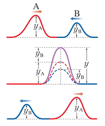 정리하면, 서로 다른 방향으로 이동하던 두 파동은 만나면 중첩됐다가 상대 파동에게 영향을 주지 않은 채 독립적으로 다시 가던 길을 간다.