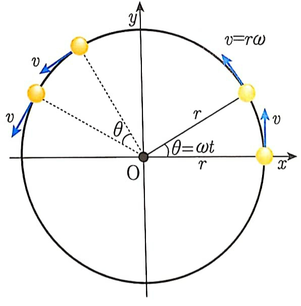 등속 원운동이란 물체가 원궤도를 따라 회전할 때 같은 시간 동안 같은 각도만큼 회전하는 운동을 일컫습니다. 즉, 등속 원운동은 단위 시간당 각도 변화량이 일정해요. 등속 원운동하는 물체의 속력은 일정하지만 방향은 원의 접선 방향으로 매 순간 변합니다.