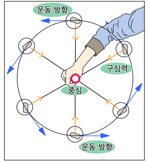 물체가 원을 그리며 돌아가는 이유는 '중심'을 향하는 '구심력'이 물체에 작용하기 때문입니다. 빙빙 돌아가는 물체는 운동 상태를 유지하려는 '관성'에 의해 구심력과 반대 방향을 향하는 '원심력'을 느끼게 됩니다. 그러나 원심력은 실재하는 힘이 아니라 그저 물체가 느끼는 '가상의 힘' 일뿐입니다. 물체를 움직이게 하는 실제적인 힘은 중심을 향하는 구심력뿐이에요.