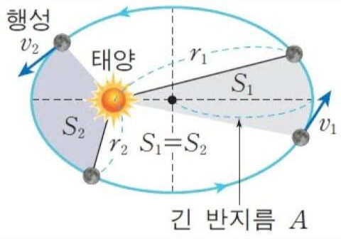 태양과 행성을 연결한 선분이 같은 시간 동안에 그리는 면적은 항상 일정합니다. 따라서 행성의 공전 속력은 근일점 근처를 지날 때 상대적으로 빠르고, 원일점 근처를 지날 때 상대적으로 느리다.