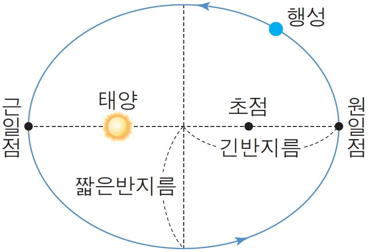 각 행성은 태양을 한 초점으로 두고 타원 궤적을 그리며 운동합니다. 행성이 지나는 타원 궤도에서 태양과 가까운 점을 근일점, 가장 멀리 있는 점을 원일점이라 합니다.
