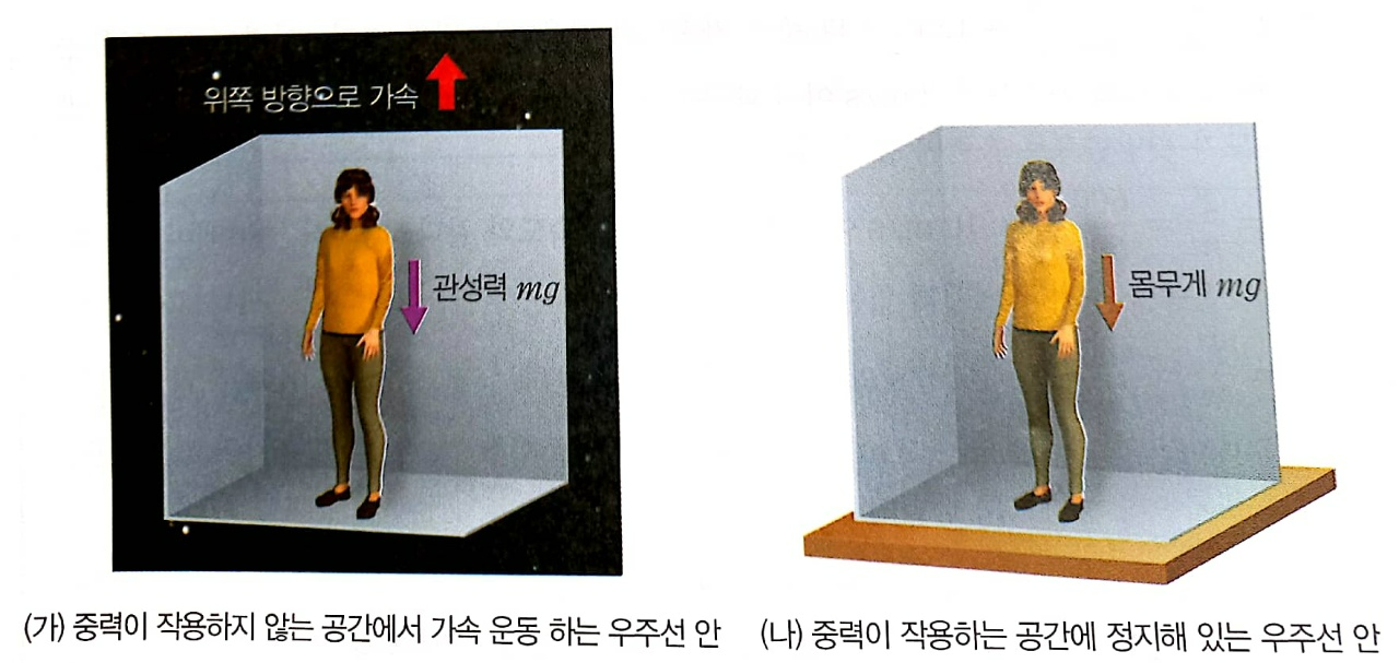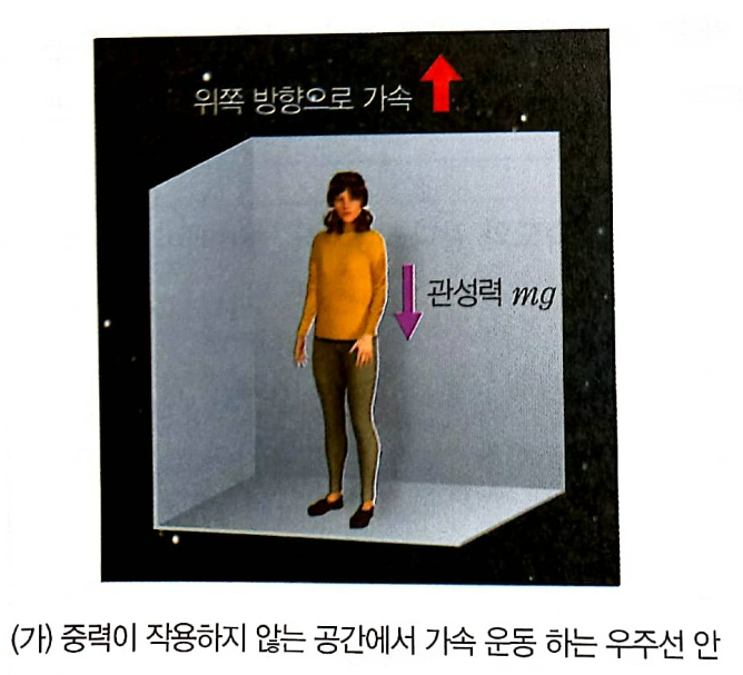 우주선이 가속도 g로 가속 운동을 하고 있다면, 우주선 안의 저울에 올라선 질량이 m인 사람은 눈금이 가리키는 값을 토대로 자신이 느끼는 관성력의 크기, mg를 확인합니다.