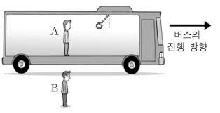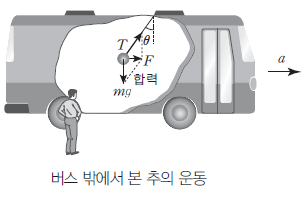 a의 가속도로 등가속도 운동하는 버스에 추가 매달려있고, 이를 관찰하는 두 사람이 있습니다. 한 사람은 버스 밖, 즉 정지해 있는 관성계에서 추를 관찰하고 있고 한 사람은 버스 안, 즉 가속도 운동을 하는 비관성계에서 추를 관찰합니다. 버스에 매달려있는 추에 작용하는 힘과 운동에 대한 이들의 입장을 들어보도록 해요.