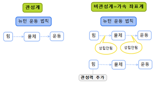 이처럼 동일한 물리 법칙이 동등하게 적용되는 관찰자는 각각 정지해있고, 등속도 운동을 하고 있으니 이를 기준으로 설정하고 이를 관성계라 하는 겁니다.