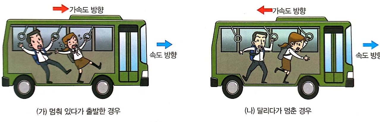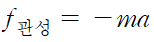 버스가 갑자기 출발할 때(=가속도 방향이 오른쪽이면) 우리는 왼쪽을 향하는 관성력을 느끼며, 반대로 버스가 갑자기 정지하면(=가속도 방향이 왼쪽이면) 우리는 오른쪽을 향하는 관성력을 느낍니다. 이와 같이 비관성계 안에서 느껴지는 힘을 관성력이라고 하며, 크기는 다음과 같아요.