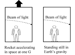 아인슈타인은 등가 원리에 입각하여 어떠한 역학 실험으로도 중력과 관성력을 구별할 수 없다고 지적하였습니다. 다시 말해 중력이 작용하고 있는 관성계과 중력이 없는 공간에서 가속되는 비관성계는 완전히 동등하다는 것이죠. 이는 서로에 대해 나란히 가속되고 있는 좌표계가 물리적으로 완전히 동등하다는 생각으로 확장됩니다. 이를 통해 관성계에만 한정시켰던 특수 상대성 이론의 인위성이 해결되죠.