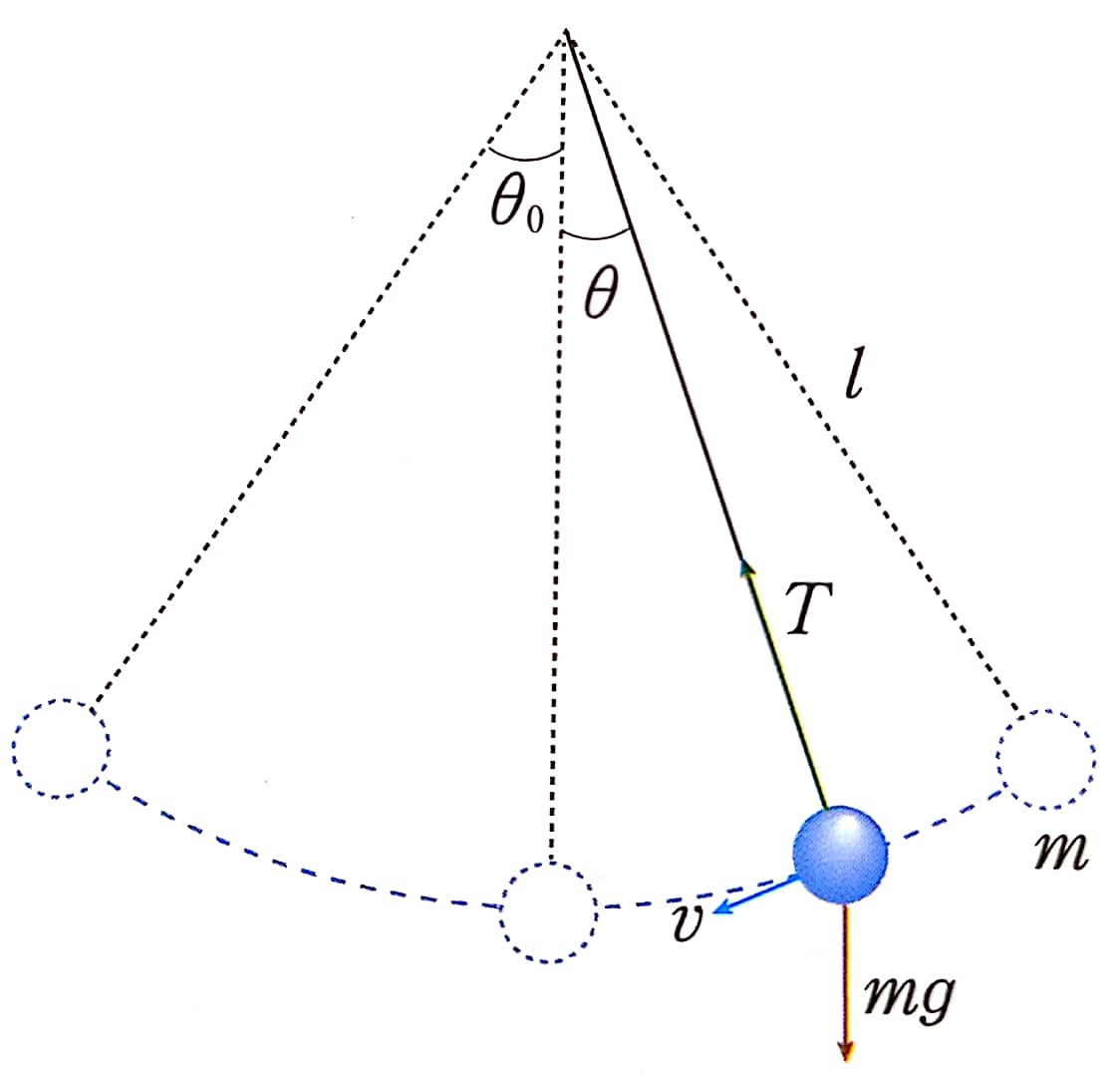 공기 저항을 무시하면 줄에 매달린 추에는 중력과 장력이 작용합니다. 그런데 장력은 추가 움직이는 방향에 항상 수직한 방향으로 작용하는 힘이기 때문에 일의 정의에 따라 장력이 추에 하는 일은 0입니다. 따라서 진자 운동하는 물체에도 중력만이 일을 하기에 진자 운동하는 물체의 역학적 에너지는 보존됩니다.