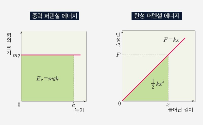 '저장되어 있는 에너지'라는 뜻의 퍼텐셜 에너지는 운동 에너지와 달리 물체가 소유하는 것이 아니고, 중력과 탄성력을 비롯하여 퍼텐셜 에너지가 정의되는 힘이 작용하는 계를 구성하는 요소들 서로가 공유하는 에너지입니다. 가령 질량 m인 물체가 h만큼 높은 곳에 있을 때의 중력 퍼텐셜 에너지는 지구와 물체가 함께 가지는 에너지이며, 원래 길이 대비 x만큼 변형된 용수철에 연결된 물체가 갖는 탄성 퍼텐셜 에너지 역시 용수철과 물체가 함께 가지는 에너지입니다.
