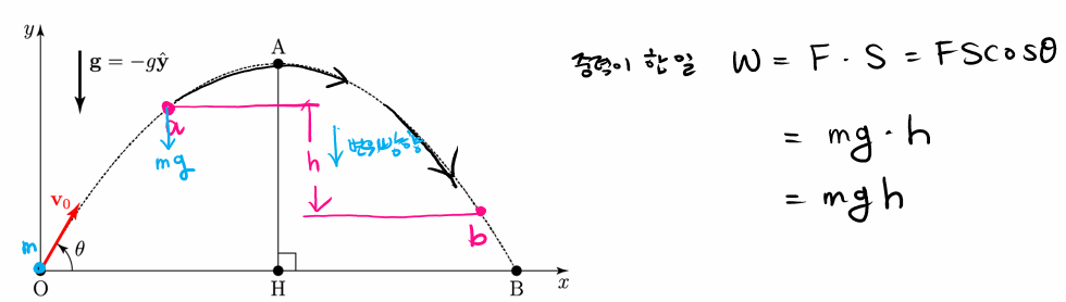 그 이유는 일의 정의에 따라 중력이 물체에 한 일을 구할 때에는 중력의 방향에 평행한 변위, 즉 이동 경로와 관계없는 운동의 시작점과 마침점의 높이만이 고려되기 때문입니다.