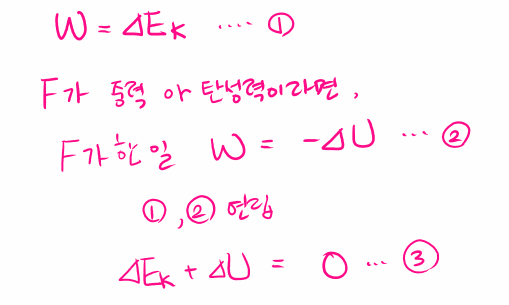 식 ③이 의미하는 건, 어떤 물체에 중력 혹은 탄성력만 작용한다면 그 물체가 어떤 지점에 있든 퍼텐셜 에너지와 운동 에너지의 합, 역학적 에너지가 보존된다는 것입니다.