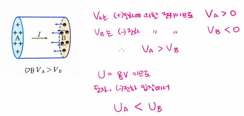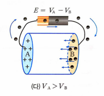 그림 (가)와 같이 도체의 두 지점 A와 B의 전위가 다르다면, 전위가 높은 곳에 있던 전하가 낮은 곳으로 이동하여 전류가 흐릅니다.
