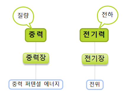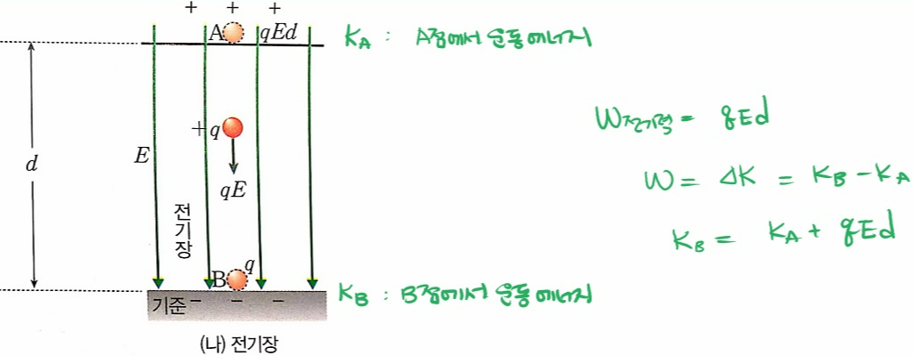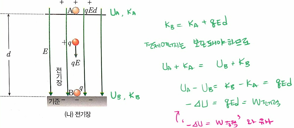 중력장에 위치한 물체가 갖는 잠재적인 에너지의 변화(=중력 퍼텐셜 에너지의 변화)가 물체의 운동 에너지에 변화를 야기하듯이, 전기장에 위치한 전하가 갖는 어떤 잠재적인 에너지의 변화가 전하의 운동 에너지에 변화를 야기하는 듯합니다.