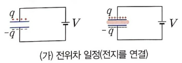 전지를 떼어냈으니 더 이상 새로운 전하들이 공급되지 않아서 축전기의 전하량이 일정하게 유지되는 상황입니다. 이때 유전체를 집어넣으면 유전 분극에 의한 전기장 감소분이 반영되어 금속판 사이의 전위차가 감소합니다. 그러나 전하량이 고정돼 있는 상황이기 때문에 같은 전위차 대비 충전되는 전하량이 증가하게 되죠.