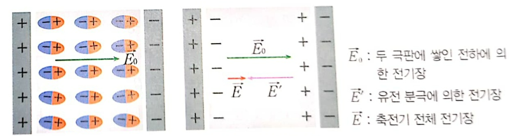 금속판 사이에 유전체를 넣으면 유전 분극에 의하여 전기장의 세기가 감소합니다. 전기장이 감소하면 V=Ed에 의해 금속판 사이의 전위차도 감소합니다. 이는 축전기에 유전체를 넣기 전과 비교해서 더 작은 전위차 V로도 동일한 전하량 Q를 저장할 수 있음을 의미합니다. 즉, 같은 전위차 대비 충전할 수 있는 전하량이 증가하는 셈이죠.