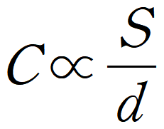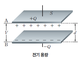 금속판의 면적이 넓을수록 구조적으로 전하가 많이 저장될 수 있고, 금속판 간의 거리가 가까울수록 양 금속판의 (+), (-) 전하는 거리에 반비례하여 강해진 전기력으로 서로를 더 많이 붙들어 맬 수 있게 됩니다. 따라서 축전기의 전기 용량은 금속판의 면적 S에 비례하고, 금속판 사이의 거리 d에 반비례합니다.